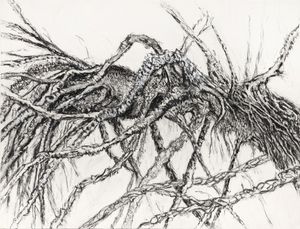 Med utgangspunkt i same motiv, har eg bevega meg frå utsida og stadig nærare innover i dei ulike gruppene. Frå skjelettstammer på avstand, for så å vere inne i kvistkaoset, til å løfte fram små bitar, utsnitt. Vise detaljane, nærleiken i det vesle.