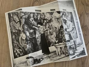 Artistbooken handler om Tove Janssons freske «Fest i Stan» tar for seg hvordan kunsten og livet har en tendens til å rote seg sammen, om forbudt kjærlighet og om freskomaleri, som jeg også driver med. Artistbooken er en onepagefold, med et foto på den ene siden og et essay på den andre. Den er trykket på risoverkstedet i Kristiansand Kunsthall.